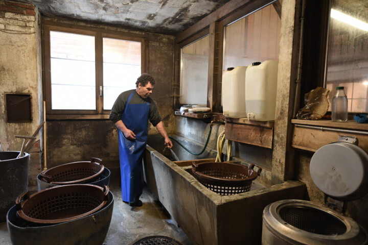 Das Rohe Alpakavlies wird in mehreren Durchgängen von Hand gewaschen.