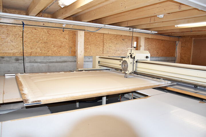 Im letzten Schritt werden die Duvets abgesteppt. Dafür wird zuerst eine Lage Baumwollstoff auf einen Holzrahmen gespannt, anschliessend wird das gekardete Alpakavlies aufgelegt worauf wieder eine Lage Baumwollstoff gespannt wird.